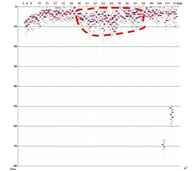 通过皮带巷顶板地震波探测结果可以看出,在测线的80m附近开始,波形开始发生变化,波形初值提前,分析为冒落区的影响范围。