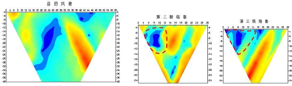 图4-3 总回风巷、第二联络巷及第三联络巷并行电法探测结果图