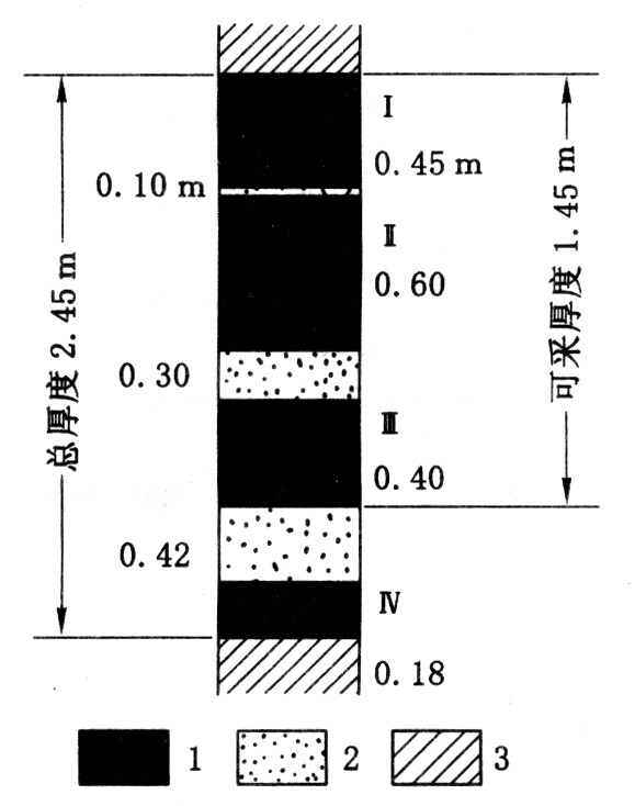 结构复杂的煤层,其厚度分为总厚度和有益厚度。总厚度,是指包括矸石在内的全厚。有益厚度,是指不包括矸石的纯煤层厚度,如图三所示。