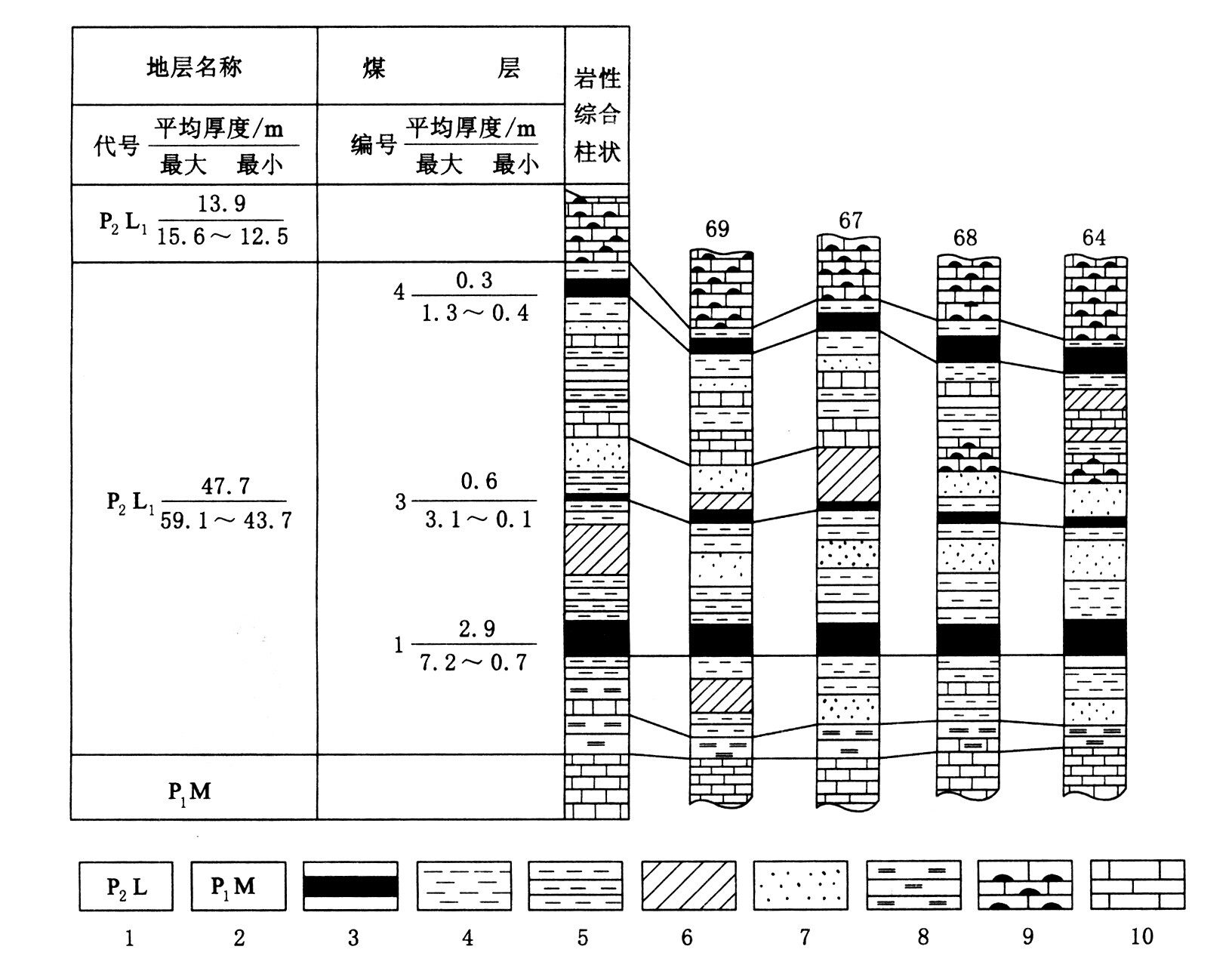 1—龙潭煤系;2—茅口灰岩;3—煤层;4—黏土岩;5—页岩;