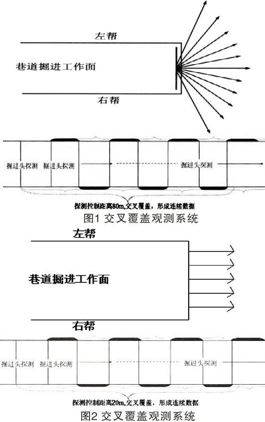 在对目标体进行探测时,合适的观测系统是必要的。对于工作面可对双巷、切眼可进行多测线多方向探测,进行联合反演会取得一定效果;某些特定目标体(采空区、导水通道等)进行多测线多方向交汇覆盖探测,可有效确定异常目标体范围;巷道超前跟踪探测,可进行多次重叠覆盖系统观测(如图1、2),会取得一定效果。选择合适的观测系统主要是减少人文干扰影响,特别是金属支护干扰。