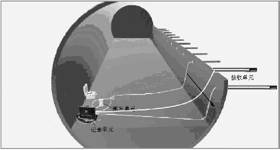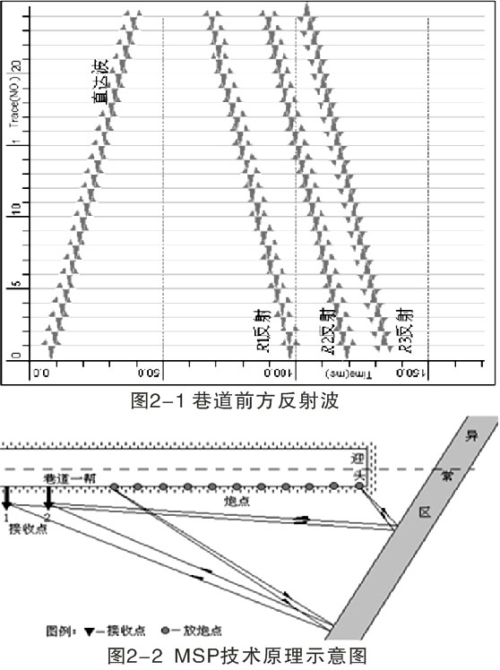 震波超前探测系统(Mine Seismic Predict -ion),英文简称为MSP。MSP技术基于反射波地震勘探原理,利用矿井巷道空间布置激发点和接收点,所激发地震波在传播过程中遇到波阻抗差异时(如破碎带,煤岩界面等)将产生反射波(图2-1)。在全空间波场条件下,巷道前方界面的反射波在时距规律、相位特征与巷道周边界面具有明显差异,这为利用地震反射波来探测前方界面的提供了有利条件。通过在专业软件(MSP2.0)平台进行数据处理和分析,处理中采用了反射波提取、速度建模、深度偏移等核心处理技术获得巷道前方地震反射偏移剖面、动力学参数等信息。根据这些信息MSP技术可以确定巷道前方断层、破碎带、煤岩界面、陷落柱的位置。