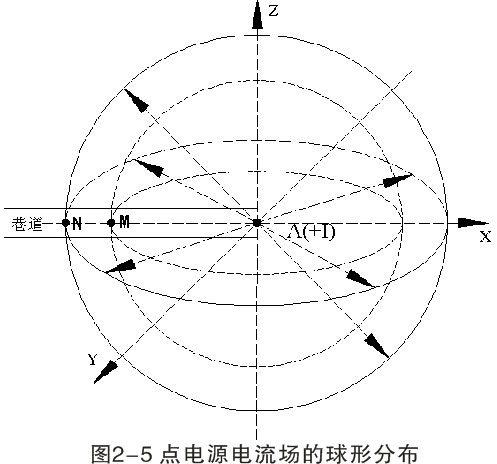 矿井电法勘探属于全空间电法勘探,供电电极A相对无穷远电极B可以看作为点电源,均匀介质中它所形成的电场可近似看作一个球体,如图2-5所示。