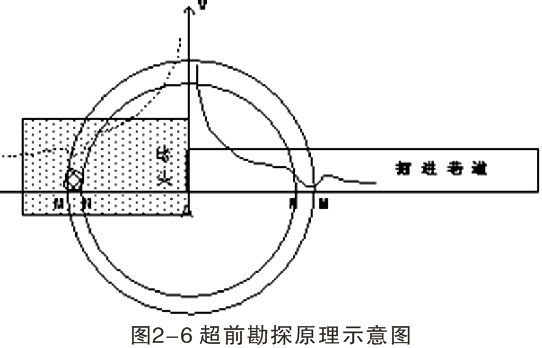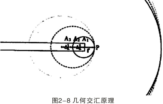 利用一个供电电极A测到的视电阻率异常是反映整个球壳内部的异常,并不能说明异常就在迎头的前方,因为在以供电电极AxO为半径的球体内(O为MN电极的中点)任何一处异常引起的等位面的变化均可以影响到测量值,因此如果测量值有异常时,不能正确判断异常点的具体位置。为了达到超前探测的目的,我们采用三个供电电极交替供电分别测量的方式,利用几何交汇的原理(如图2-8所示),只反映出迎头前方的异常情况。这种方法可以消除顶板、底板和后方的影响,反映巷道迎头前方的地质异常,达到超前探测的目的。