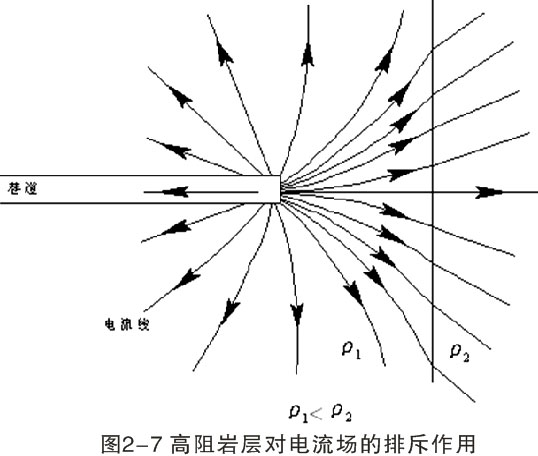 若电流分布范围内存在电性异常(如含水地质异常体),不论异常体在巷道迎头前方还是其它方位,都会引起等位面的变化,视电阻率也会发生变化。若是低阻异常体会引起视电阻率值降低,反之,会引起视电阻率值增高。比如,图2-7是巷道迎头前方存在高阻异常体时,因其排斥电流而引起整个电流场的畸变,使测量电极附近的电流密度增大,故视电阻率增大。