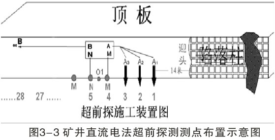 本次探测设计矿井直流电法供电电极A1,A2,A3间距为4m,测量电极M、N间距为4m,供电电极A1距掘进头约14m,测量电极M、N移动次数30次,每组M、N测量电极对应3个供电电极A1,A2,A3,共计90个测点数据,如图3-3所示,探测深度为85m。