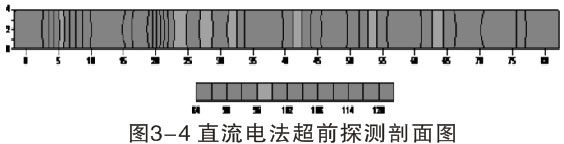 从图3-4超前探测结果中可以看出,在有效探测深度为85m范围之内,发现1处高阻异常,分别命名为高阻异常1。高阻异常1位于距掘进头约18m~20m附近。结合地质资料及现场施工环境分析,推断高阻异常1应为陷落柱边界。