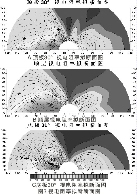 经数据处理,下图为掘进工作面顶板30°、顺层0°、底板30°三个方向横剖面视电阻率等值线图,视电阻率最高值130Ω•m,最小值2Ω•m。