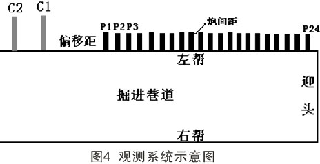 本次探测在90103轨道顺槽进行,观测系统使用双检波器同侧后置锤击点布置在巷道左侧帮,检波器布置在距离迎头处21米,偏移距为3米,此后保持检波器位置不变,锤击点依次向后推移,炮间距1米。观测系统示意图如下所示。
