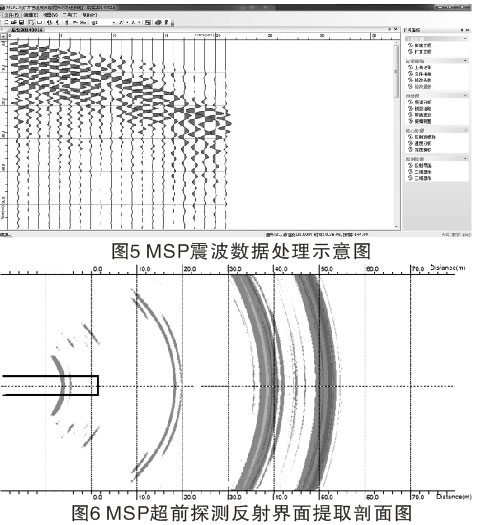 现场采集到的地震波信号经过处理才能转化为可以利用的物性图件,MSP震波探测数据在自行研发的MSP2.0软件平台上进行,其处理流程为:数据预处理——频谱分析——直达波求取——反射波提取——速度分析——深度偏移——界面提取。根据速度谱同时结合现场岩性情况90103轨道顺槽震波速度采用2.5m/ms。深度偏移是处理时MSP处理的核心部分,在给定速度模型的条件将来自前方介质的能量偏移归位到空间点上,以此图件作为提取反射界面的基础。