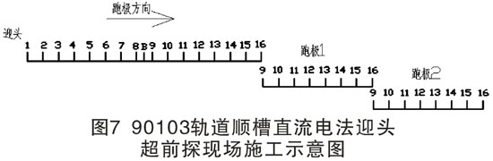 本次试验在90103轨道顺槽720米处进行,超前探现场数据采集于2014年9月17日完成,测线起点位置位于迎头处,现场布置1个测站,共跑极5次,每次共布置18个电极,其中16个为测量电极、一个N极和一个B极,每相邻两个测量电极之间的间隔为2m。每次跑极保持1-8号电极不动,每次采集结束,向B极方向移动9-16号电极,测线总长度为80m,现场施工布置见下图。