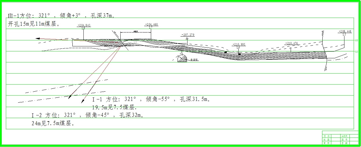 1 概况己17-24181机巷沿己17煤层掘进,该巷道在掘进过程中断裂地质构造发育,煤层特征变化较大,当巷道掘进至L7点前68.5m处时进行钻探,共施工三个孔,详情为:Ⅰ-1孔,方位321º,-55 º,孔深31.5m,开孔后19.5m后见7.5m厚煤层;Ⅱ-2孔,方位321 º,倾角-45 º,孔深32m,开孔后24m见7.5m厚煤层;Ⅲ-1孔,方位321 º,倾角+3 º,孔深37m,开孔15m后见11m厚煤层。根据巷道实际揭露煤层情况及钻孔资料,矿方地测科推测在己17-24181机巷掘进前方存在一条逆断层。针对此地质问题,矿方决定采用多种物探方法进行探测,验证地测科提供的地质推断,为己17-24181机巷的安全、高效掘进提供有效技术依据。