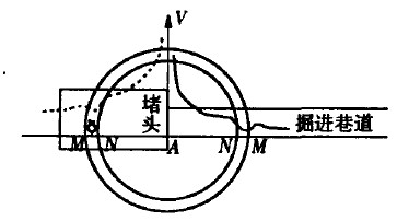 相对于全空间均匀介质中点电源电位分布的同心球面,在非均匀介质中,等位球面的某个位置将发生某种程度的畸变而成为一个等位曲面,这将决定于介质中异常体的位置及导电性强弱。假设异常体处于有利的空间位置、具有适当的规模并与周围介质存在足够明显的导电性差异,则在异常体的不同边界(假设为内侧与外侧,也是其与周围介质的界面),等位面会有明显畸变,即异常体内侧与外侧电位有显著差异,这种差异通过仪器观测和有关计算可以捕捉,基于此电法超前探测得以基本的理论支持。电法超前探测原理示意图如图2-1。在A点供电,测量电极M、N的电位差是过M、N的2个同心球壳等位面的电压降,在全空间条件下,球壳体包含了供电点前后左右上下等各个方向的体积。显然,前方的异常信息也可以反映到MN处。如超前勘探原理图所示,巷道堵头内某位置的异常会使测量电位差曲线产生畸变,但该畸变在堵头内部并不能直接测量,图2-1中虚线所示。由于体积效应,畸变的实质是球状等位面发生畸变,即MN所在的球壳发生变形,根据等值性原理,在掘进巷道内的测点上也可以观测这种变化,所不同的是幅度可能会降低,如图2-1中实线所示。