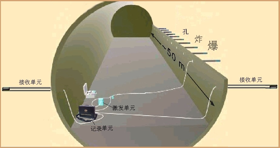 矿井震波超前探测(MSP-Mine Seismic Prediction),是应用地震波在传播过程中遇到不均匀地质体(存在波阻抗差异)时会发生反射的原理,结合巷道的特点,设计研制的沿巷道后方布置震源和传感器来探测巷道前方地质条件和水文地质条件的观测系统。震波是由特定位置进行小型爆破产生的,爆破点一般是沿巷道左(右)帮平行洞底成直线排列,这样由人工制造一系列有规则排列的轻微震源,形成地震断面。这些震源发出的地震波在遇到地层层面、节理面、特别是断裂破碎界面和溶洞、暗河、岩溶陷落柱、淤泥带等不良界面时,将产生反射波。