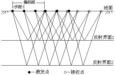 反射共偏移探测技术是依据反射波勘探原理,在单边排列分析基础上选定最佳偏移距,采用多次覆盖观测系统(如图2-4)进行数据采集。探测时,首先针对测试区域地震地质条件利用单边排列方法进行现场噪声调查,对排列记录分析对比,确定最佳共偏移接收窗口,并按一定的步距同步前移完成探测任务。只要地质体中存在波阻抗差异,就会产生反射回波,且反射能量受界面特性控制,这是进行地质体分辨的前提。通常在现场实际工作中,常用密集型双道共偏移数据解决实际问题。它在对地质体的连续追踪中发挥着重要的作用。