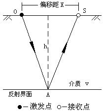 根据反射波勘探原理,以水平反射界面为例,则单道观测系统有相应波路图(图2-6),且它的时距曲线方程为:
