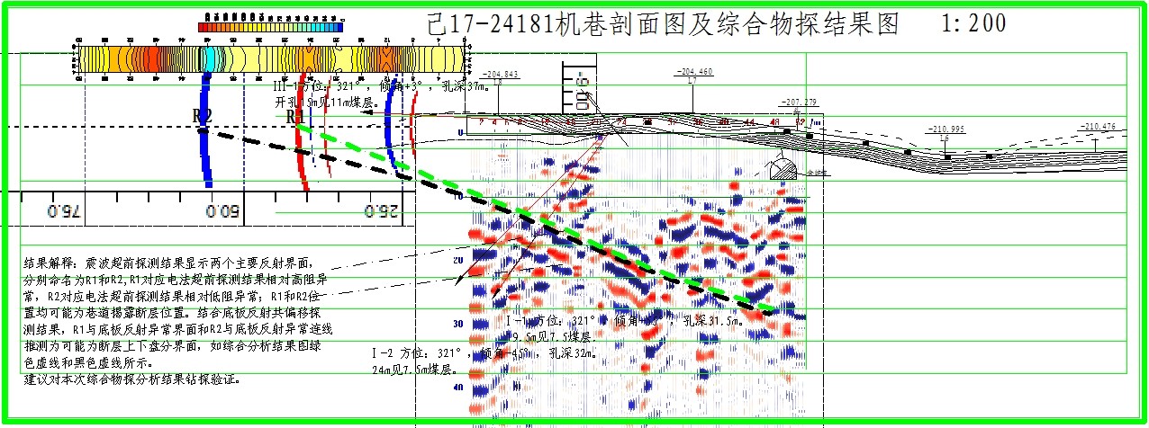 通过图3-4三种物探方法综合分析结果图可知,震波超前探测结果显示两个主要反射界面,分别命名为R1和R2,R1对应电法超前探测结果相对高阻异常,R2对应电法超前探测结果相对低阻异常;R1和R2位置均可能为巷道揭露断层位置。结合底板反射共偏移探测结果,R1与底板反射异常界面和R2与底板反射异常连线推测为可能为断层上下盘分界面,如综合分析结果图绿色虚线和黑色虚线所示。