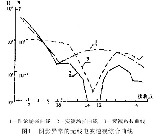 1) 阴影异常。实测场强曲线的异常部分低于理论场强曲线见图1,这是由于煤层的吸收系数小于构造体,所以异常的特征是阴影,场强值因异常的屏蔽而小于正常场强。