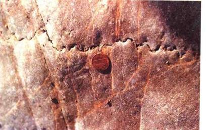 “非透入性”构造指那些仅仅产出于地质体的局部的构造,如断层面或节理面,变形主要集中在断层面或节理面及其附近,其间的岩块很少或没有受到变形,如图二所示。