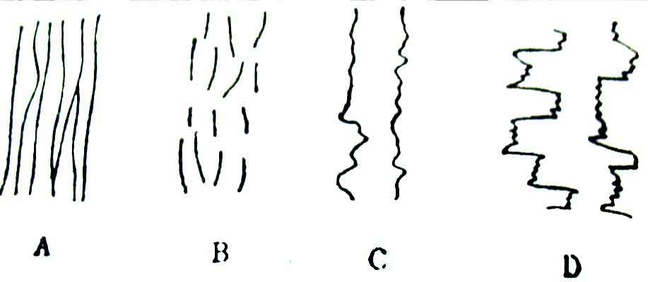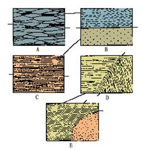 ① 不同劈理化岩石中劈理域的形态各异。按劈理域垂直断面上形态的平直程度,其平面度可分为平直的、粗糙的、锯齿状的和缝合线状的,如图七所示;