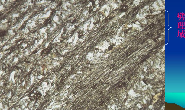 劈理岩石的基本微观特征之一是具有域构造,表现为岩石中劈理域和微劈石相间平行排列,如图五所示。