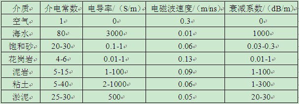 一般海堤探测断面的介质层大致为抛石层、土石混合层、淤泥层,抛石、淤泥及海水等介质之间有较明显的电性差异,具备雷达探测的基本物性条件,表1是常见介质的电性参数。