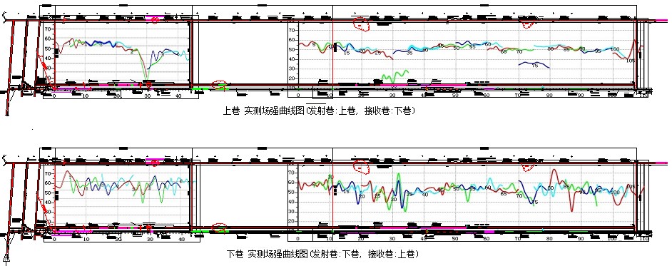 由于施工时现场未停电,本次所采集数据实测场强值总体上在40~70db,最小值36db。从实测数值来看,进风巷背景测试值较高,在40db左右,回风巷背景场测试值较低,在25db左右,与最高场强值相比,有一定的变化范围,说明本次采集数据进风巷信噪比较低,回风巷信噪比相对较高。