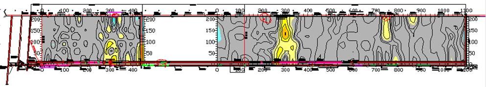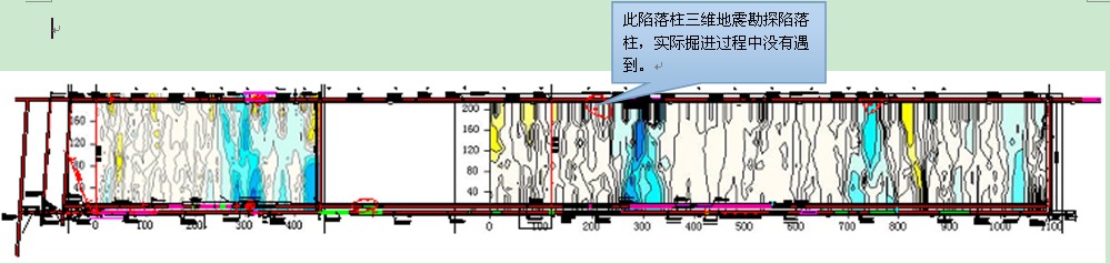 YDT88矿用无线电波透视仪实测场强分布图,见附图2,其中蓝色调区越深表明其场强值越低,即该段煤层无线电波穿透能力弱,为潜在的构造异常区。图中各段情况反映结果与实测场强曲线结果基本一致,在此不再赘述。