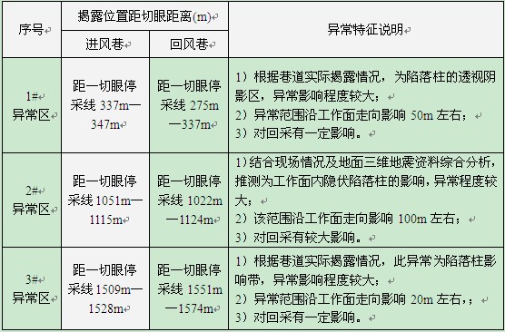 据实测场强值变化特征和SIRT反演吸收系数(CT成像)图综合分析,本工作面主要有3个探测异常区,各个异常区探测结果见下表5-1所示。