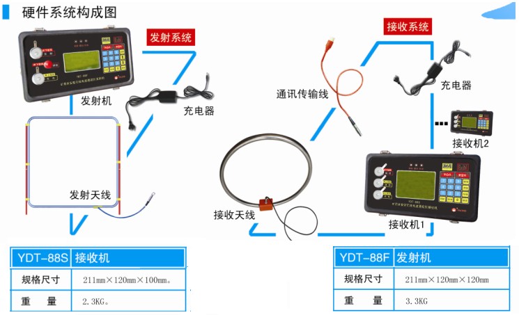 本次勘探使用YDT88矿用无线电波透视仪,YDT88矿用无线电波透视仪是由福州华虹智能科技股份有限公司联合相关高校院所,引进先进的数字通信调制、高速采集、嵌入式系统等技术开发完成的新一代无线电波透视仪。该仪器具有轻便灵活、智能高效、透视距大、抗干扰能力强、续航时间长等特点。同时基于仪器所形成的“一发双收”“一发一收”等现场工作方法,极大提高现场施工效率和探查精度。图2-2为YDT88矿用无线电波透视仪系统组成图。