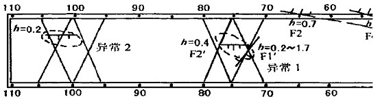 YDT88矿用无线电波透视仪SIRT反演吸收系数(CT)成像图,见附图3,该图中吸收系数的强弱表明煤岩层介质的差异,图中暖色色标表示强吸收系数值,其暖色越深表示存在异常的可能性越大,因此可以对内部构造及其特征进行判定。