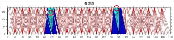 如上叠加图所示,浅蓝色部分即为异常交汇法得到的叠加异常区,蓝色部分为排除异常区范围,结合地质资料,圈定陷落柱范围需要压覆该浅蓝色部分内的所有射线,我们便可以大胆圈定如下陷落柱大小和范围: