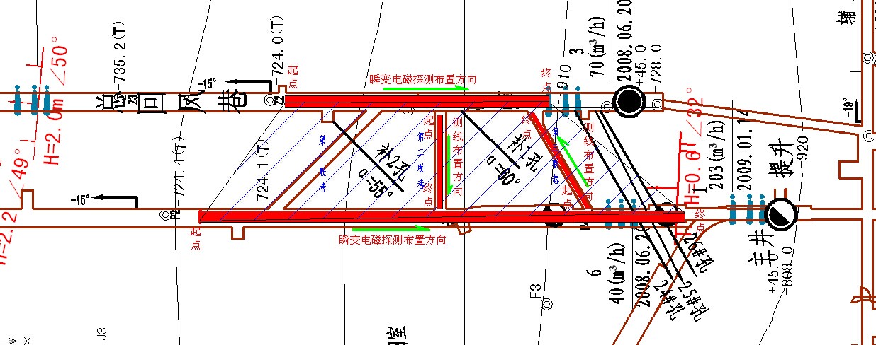 本次瞬变电磁探测于2014年7月6日-7月7日完成现场数据采集,采集区域包含皮带巷128m(起点在P2点向东9m)、总回风巷70m(起点在导Z2点向东4m)、第二联络巷24m(起点在二联巷在回风巷开口处)、第三联络巷20m(起点在三联巷在皮带巷开口处)。