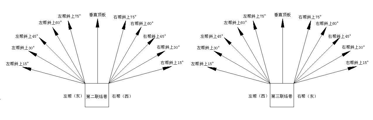 本次主要是探测仓顶冒落区附近M4砂岩含水层的导水情况,所以在皮带巷设计5个方向、总回风巷设计3个方向、第二联络巷及第三联络巷分别设计11个探测方向。现场测点布置为每2m一个测点,具体的测线布置如图3-1所示( 红色线条表示测线布置位置),单个测点布置方向如图3-2所示。