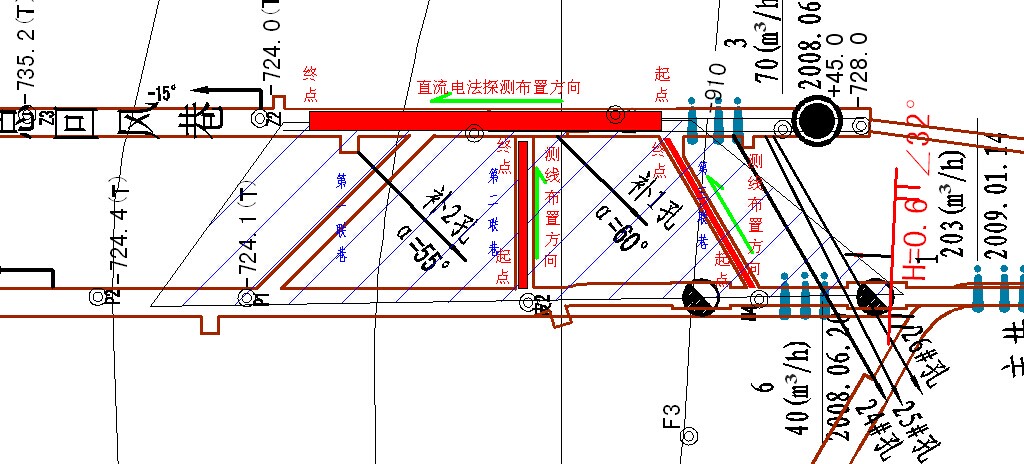 为了对瞬变电磁及震波探测结果的补充,在总回风巷、第二联络巷及第三联络巷布置直流电法探测,通过探测结果可以分析这些巷道的岩层电性的分布情况,来判断岩层的富水性。