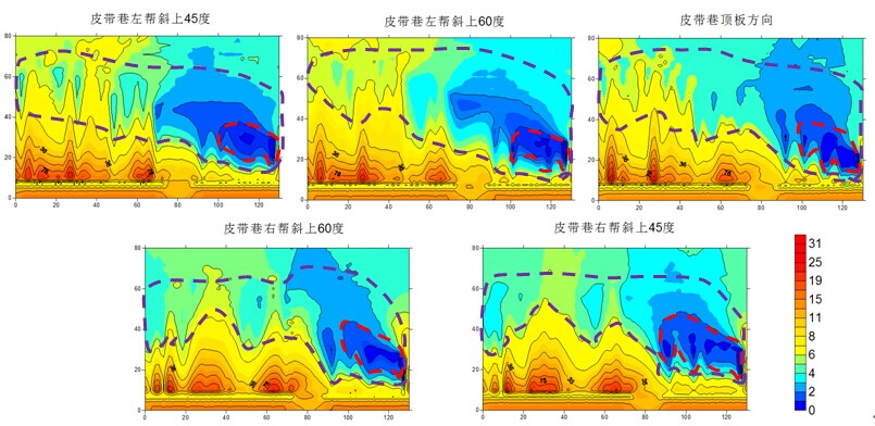 经数据处理、分析,获得皮带巷、总回风巷、第二联络巷及第三联络巷顶板岩层波组分布图,通过分析波组的分布特征来判断岩层的物理特性,可以反映出冒落区的影响范围,图中原点在P2点向东24m。