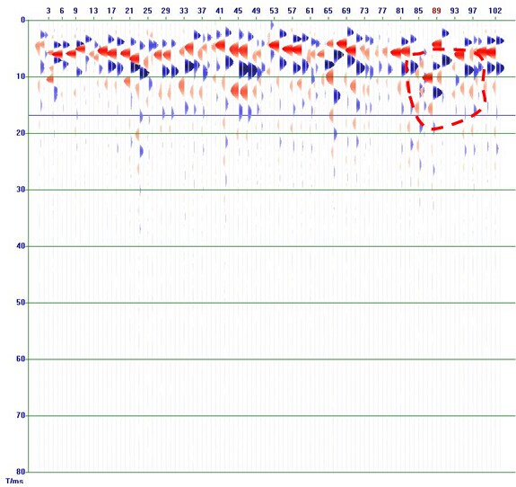 图中红色圈出的范围为地震波波谱变化带,通过对同位置两次震波探测信号对比,通过注浆加固后,对冒落区附近进行一定填充,岩体裂隙集中区范围有一定缩小,但该区域内仍可能存在一定裂隙(相关异常区不排除是注浆后顶板介质性质差异导致)。