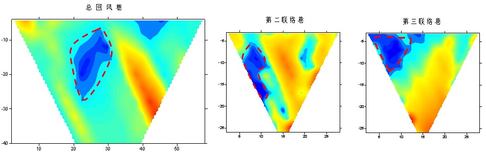 图4-3 总回风巷、第二联络巷及第三联络巷并行电法探测结果图