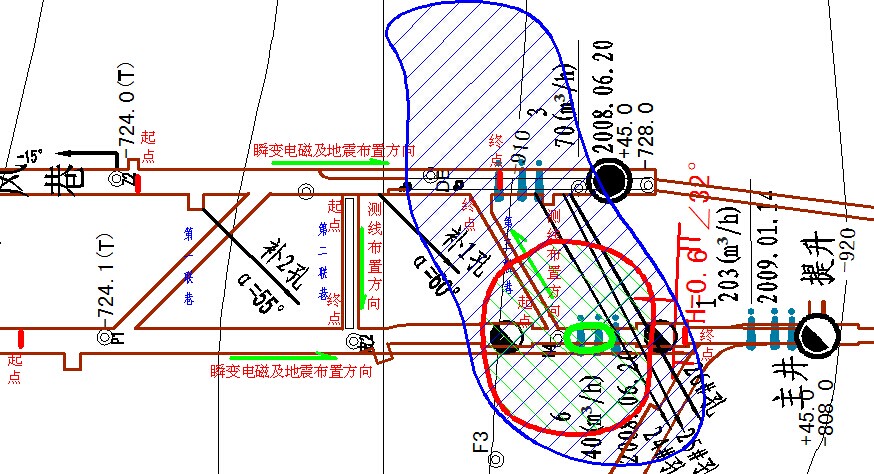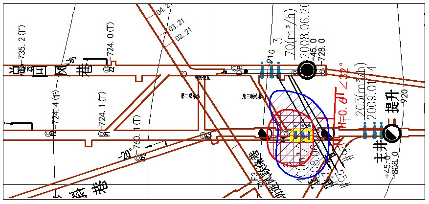 图5-1和图5-2分别是2013年10月和2014年7月根据皮带巷、总回风巷、第二联络巷及第三联络巷的瞬变电磁、地震波及直流电法的探测结果结合现场的地质情况推断出的该冒落区的影响范围。