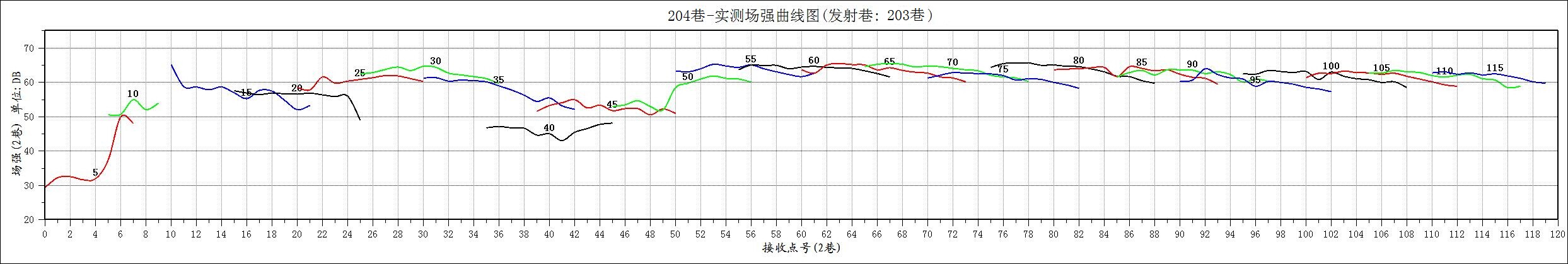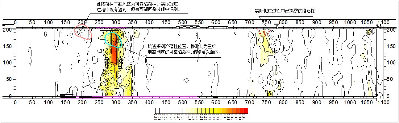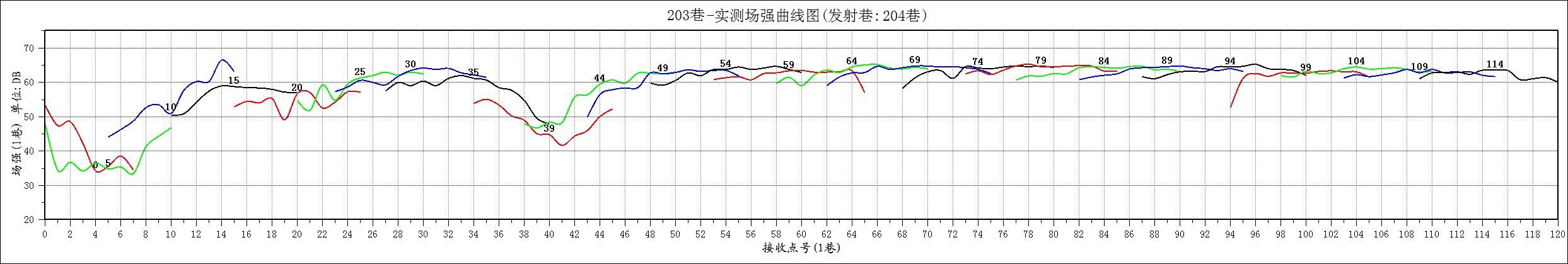 下面的a、b、c、d四个案例是来自晋煤地区不同工作面的探测,分别用现场的实测场强曲线来说明陷落柱的反映特征,同时验证情况与实际揭露或地面三维地震结果相吻合(c案例中三维地震探测的陷落柱在实际掘进巷道中没有揭露,综合推测陷落柱偏移至工作面内,如探测结果的异常位置)。