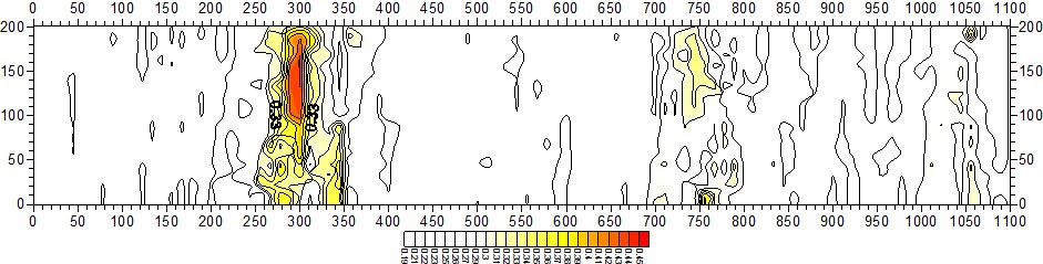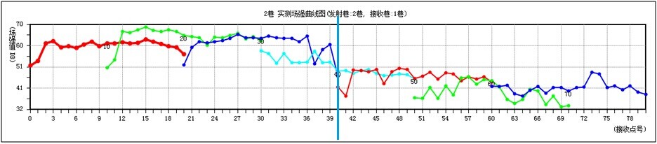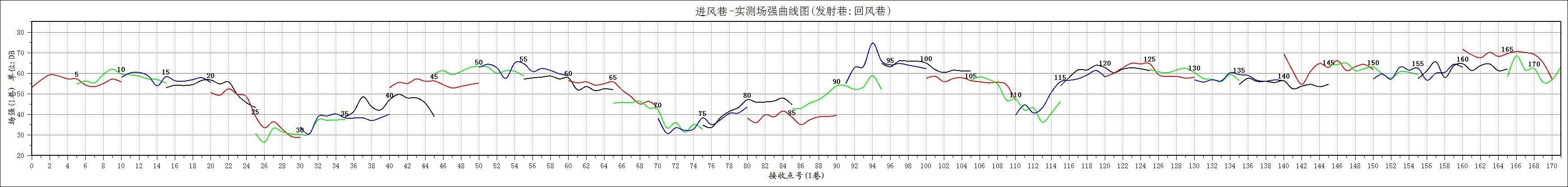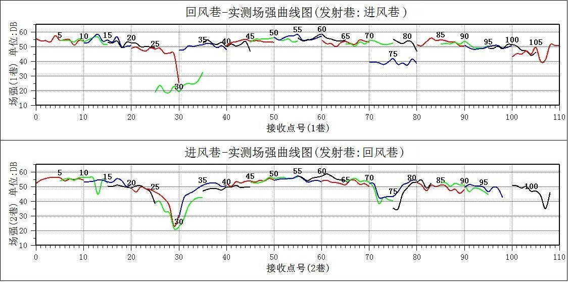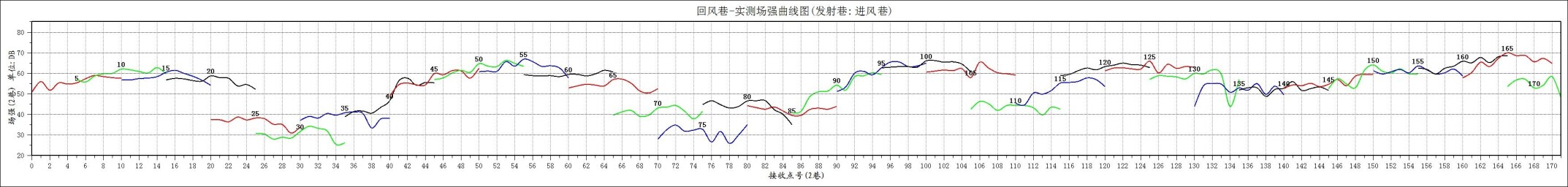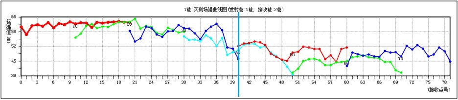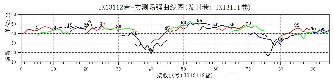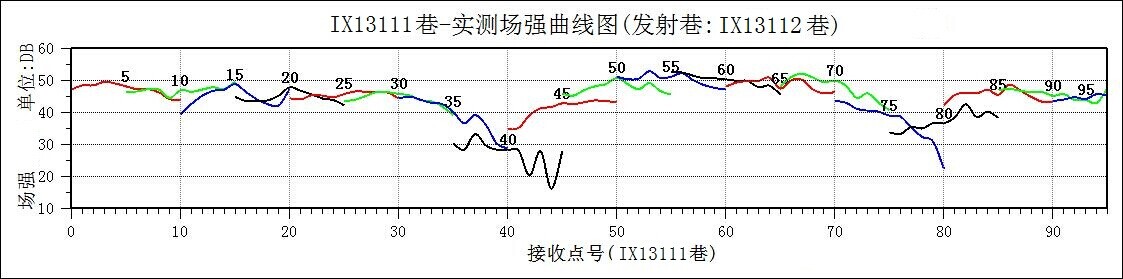 隐伏断层的存在常给回采造成严重影响,地质工作一般无法预料和推断。采用无线电波透视预测隐伏断层,具有很重要的意义。尤其走向长的隐伏断层是很难判断的,走向很长的隐伏断层的曲线表现为在隐伏断层内的测得场强比较低,而在隐伏断层外场强变化很大。如下图e案例为贵州某矿1803工作面的实测场强曲线,从该曲线图上可以看出在40~79#点的场强值低于0~39#点的场强值。该段场强值较低,穿透性较差,表明该段煤岩层对无线电波的吸收系数较大,部分地段很低,可能为近走向断层带或裂隙带发育影响。