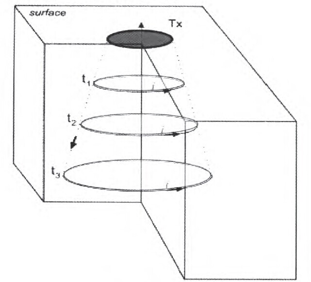 由于介质的欧姆损耗效应,感应电流将会迅速衰减,这种衰减迅速的磁场在其周围的地下介质中感应出新的强度更弱的涡流,这一过渡场继续下去,直至大地的欧姆损耗将能量消耗完为止。这便是大地中的瞬变电磁过渡场,伴随这一过渡场存在的电磁场就是大地的瞬变电磁场。应该指出,由于电磁场在空气中传播的速度接近光速,比在导电介质中传播的速度大得多,当一次电流断开时,一次场的剧烈变化首先传播到发射回线周围地表各点,最初激发的感应电流局限于地表,地表各处感应电流的分布也是不均匀的,在紧靠发射回线一次磁场最强的地表处感应电流最强。随着时间的推移,岩体的感应电流便逐渐向深部、向外扩散,其强度逐渐减弱,分布趋于均匀,感应电流呈环带烟圈装分布(图2)。