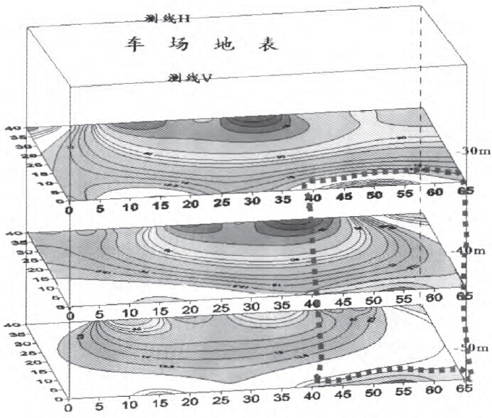 本次探测所采用福州华虹智能科技股份有限公司最新研发的YCS256瞬变电磁系统。探测采用共中心分离回线装置,采用这种装置可以减少线圈之间的互感影响。发射线圈匝数10匝,接收线圈匝数20匝,发射线圈边长8m,接受线圈边长6m,在车场采用3条横向测线两条纵向测线。