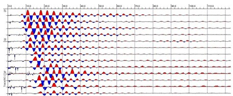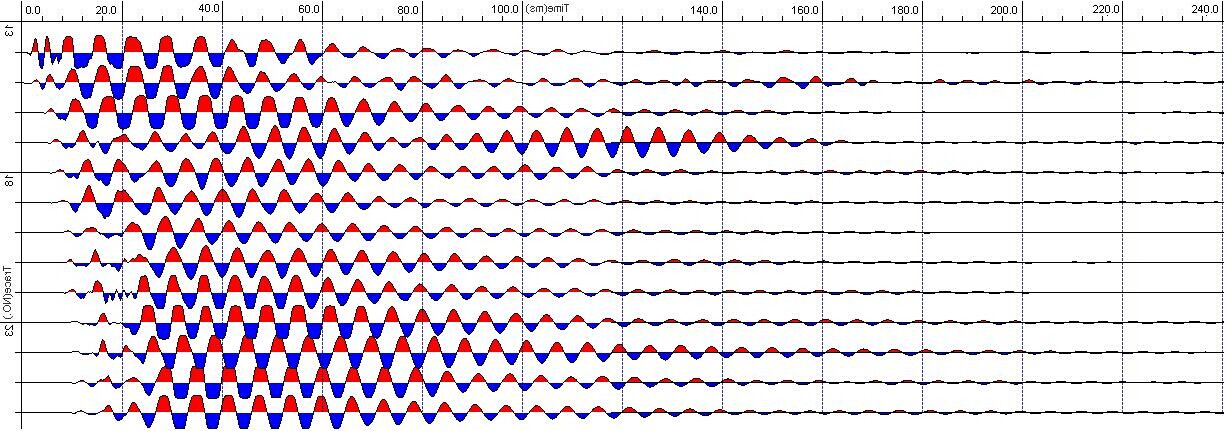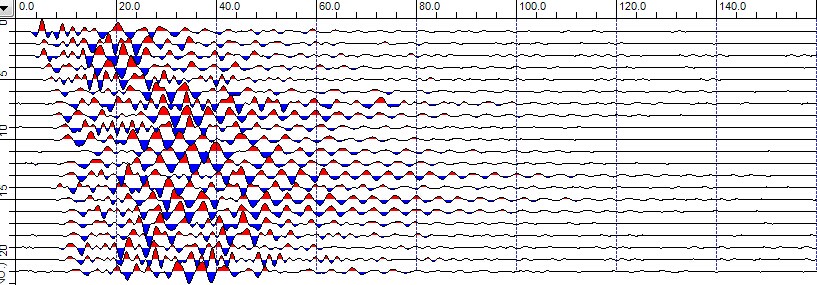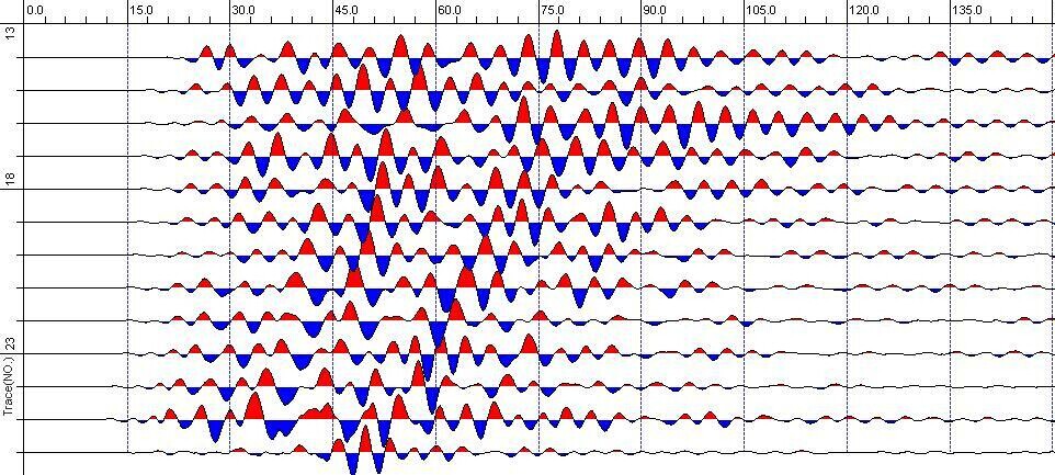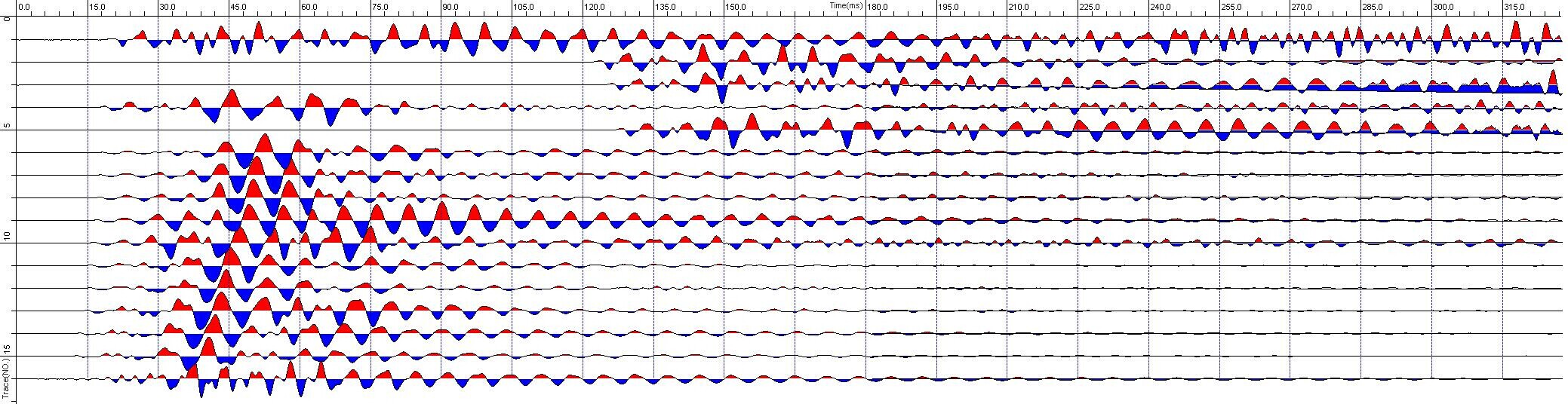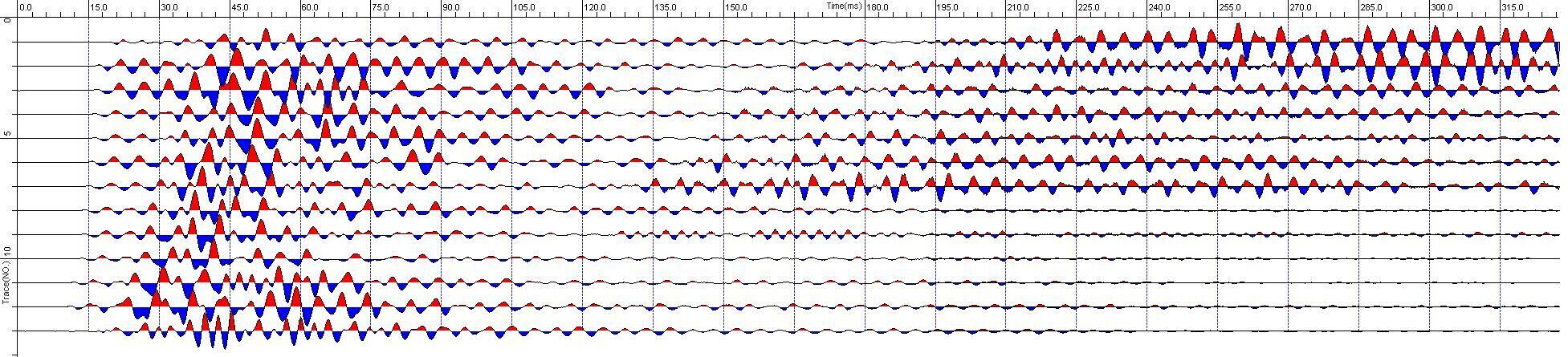 4、炮孔封孔质量对数据质量的影响:在采用炸药震源时,炮孔中的炮泥是否堵死至孔口对数据质量的影响亦较大。若炮泥未堵死,放炮时,声音会比较清脆,这是由于炸药能量迸发出来的结果,这样就会造成声波对数据的干扰比较强烈;相反,若炮泥足够多的情况下,放炮时会是比较“闷”的声音,这样声波的干扰就会相对较小。如图6所示,前七道波形后期振幅依旧很大,就是因炮泥未堵死,声波产生的干扰,通常后期的信号不能参与计算。