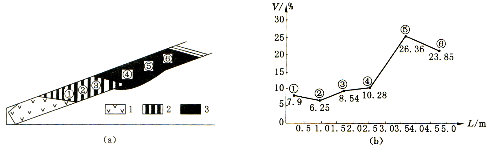 (a)剖面图;(b)煤的挥发分与其距侵入体远近的关系图