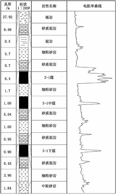 矿井位于蒙西东胜煤田的西北部边缘,其构造形态总体为一向北西倾斜的单斜构造,褶皱、断层不发育,但局部有微弱的波状起伏,无岩浆岩侵入,倾向N30°~40°W,地层倾角1°~3°,地层产状沿走向及倾向均有一定变化,但变化不大。该矿侏罗系地层为一套陆相沉积物,其沉积基底为三叠系上统延长组(T3y)[4,5]。3-1煤层为首采煤层,厚度0.6~8.4m,平均4.45m。直接顶为砂质泥岩,老顶为细粒砂岩,岩石的力学强度较低,抗拉强度0.55~5.54MPa,抗剪强度2.03~16.55MPa,软化系数0.08~0.55;底板为泥岩,厚度一般在1m以内,砂泥质结构,微波状层理,力学强度低,遇水易软化变形,因此,煤层顶底板岩石的稳固性较差。图1为工作面综合柱状图。从电阻率曲线可以看出:煤与岩石的阻值差别很大,瞬变电磁对低阻响应比较敏感,可以有效查明前方是否存在地质异常。