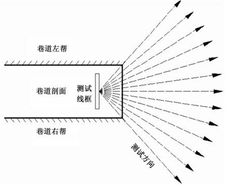泊江海子矿3-1煤层巷道掘进中,其断面尺寸大,为5.2m×4.0m,现场探测时瞬变电磁线框采用边长2m×2m的多匝小线框同心回线布置方式,在3-1煤层首采工作面上下顺槽跟踪探测时采用扇型观测系统布置,实施探测点数多,易于进行数据对比分析。图3为扇型观测系统布置,即以巷道迎头立面中心为原点,沿巷道左帮、迎头和右帮采集数据,每个数据点处观测3个方向,分别为仰角45°顶板方向、水平顺层方向和俯角45°底板方向。处理时该数据常采用虚拟坐标方式,将3个方向数据依次排放,形成左帮、顺层、右帮的统一电阻率剖面,其重点是关注中间顺层数据,两帮数据由于测试影响条件不同,仅起到电性参数对比作用。