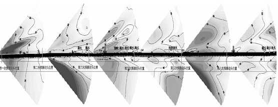 首采面上、下顺槽掘进过程中,主要受顶板砂岩、砾岩中的孔隙水的影响。探测中依据交叉掩护式探 查,即每次探测根据电阻率剖面情况预报90-100m岩层富水状况,当巷道掘进80m时进行下一次探测,保证每一次探测均有控制覆盖,且当遇到地质异常加密观测。目前,3-1煤层首采面上下顺槽已掘进达千米以上,现对其中的几次探测成果进行总结。图4为巷道前方连续超前探测顺层方向瞬变电磁扇形剖面。探测控制距离为迎头前方10~100m,其中0~10m为关断时间及互感等产生的浅部盲区。测区内电阻率值分布在5~60Ω•m,高阻值分布普遍,局部存在低阻异常值。根据测区内煤岩体地质特征及探测经验将低于10Ω•m的区域解释为低阻异常区。推断测区内岩层整体赋水性弱,低阻区为顶板砂岩孔隙含水表现。矿方根据每一次瞬变电磁超前探测结果,确定探水孔位及防治水技术措施。