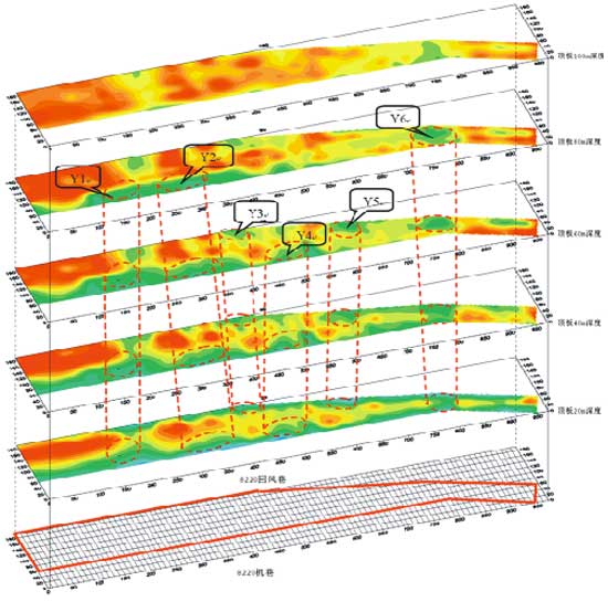 通过8220工作面顶板不同深度探测结果切片图(图4-1),可以综合分析工作面顶板探测范围内纵向电性变化情况。