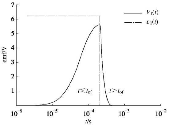 假设tof=0.2ms,S=10㎡,n=4匝,a=1m,I=2.5A,M=0.0005H,接收系统的阻尼系数ξ=1.05,分布电容C=0.000001F,电感L=0.001H,内阻r=1.5Ω;外电路电阻R可根据ξ的关系求出。将上述参数分别代入式(3)和(8),依据式(4)可求出一次电动势ε1(t)及V1(t)。如图1所示,理论ε1(t)在关断时间以前为一恒值,关断时间后为0,而V1(t)分成上升沿(t≤tof)和下降沿(t>tof)两段,由此可见,ε1(t)不仅对电流关断前测试数据有干扰,还对电流关断后测试数据有一定的影响。
